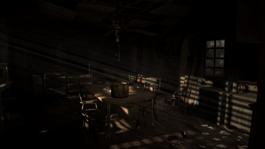 In the same light, Resident Evil 7 uses its effects to it’s fullest potential in the darkness as well. Underneath tables and behind half closed doors lies complete blackness. Obscured shapes veiled in shadow make it hard to tell if there’s a creature lying in wait or just some old lamp.