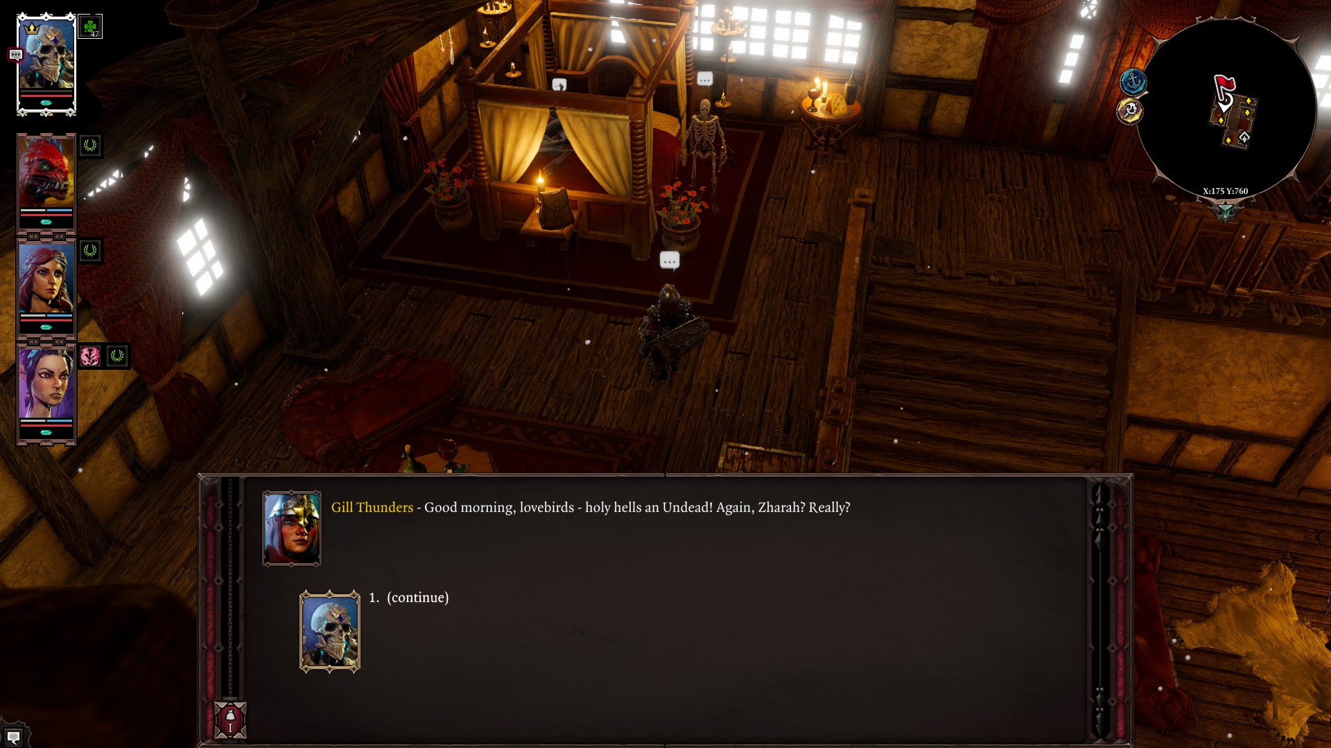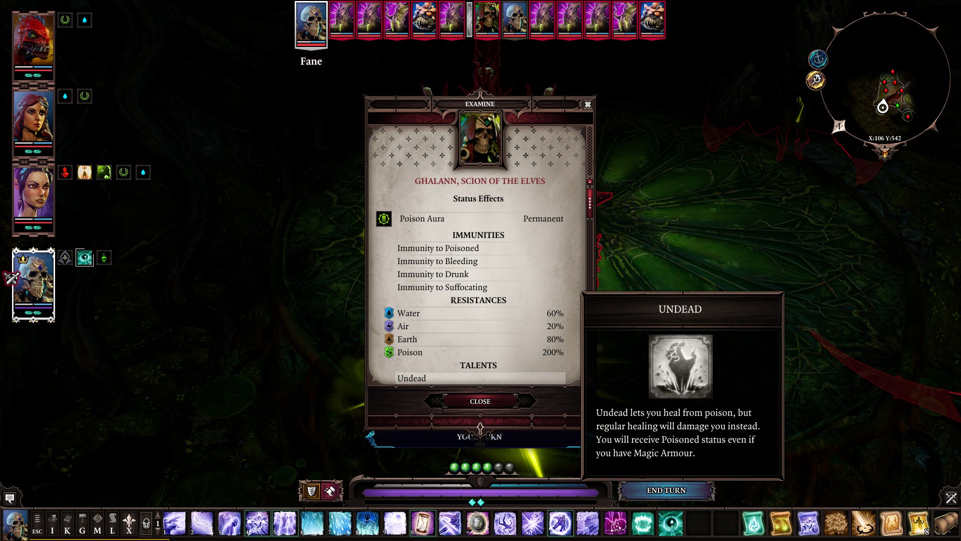 But there’s one thing I noticed this time I played Divinity that I didn’t fully understand when I played in 2018. I think because of the games that I’ve played I get locked into the idea that my character fills the role of a class or a job like in Final Fantasy or something – and that’s all they do. Hybrid classes are just a weaker version of whatever jobs they’re mixing together. So, I end up forcing myself to only get skills that correspond to the skill points I’m putting into my character: if I’m putting points into Pyrokinetic (boosts fire damage 5% for each point put into it and lets you learn higher level fire skills) I can only use fire skills, if I’m putting points into Warfare (boosts physical damage 5% for each point put into it and lets you learn higher level warfare skills) I can only use melee skills. But that’s really not how it is at all in this game, the game is literally built off of synergies: skills that work really well with other skills. Water or hydrosophist skills work really well with electricity, or aerotheurge skills. And you don’t even really have to have two separate party members to make this work. When you first boot the game up and you get to pick what “class” you want your MC to be, there’s a class called enchanter which gives you water and electric skills. You get a skill called rain, which is kind of funny because all it does is summon this stupid fucking rain cloud that just makes it rain on a surface. When you first start you might not understand what the point of this skill is. I mean it’s literally called fucking rain. But it’s sets the status ‘wet’ on all characters in the area, which makes them take a little bit more damage from water and electric skills – which is honestly pretty good. But ‘wet’ does something even more fucked up than that. Because the way most aero and hydro skills work is that it sets either something called ‘shocked’ or ‘chilled’. Both of them are debuffs that are pretty bad on their own, like I think one of them reduces your AP per turn and the other slows you and reduces your accuracy. That kind sucks. You know what sucks even more? Getting hit by one of those skills again. Then you’re just done. I do not get to play the game anymore. I get to watch fourteen computers beat the living shit out of me for ten minutes because if you get shocked and chilled set on you again while you already have that status effect applied, you’re now either stunned or frozen, meaning you lose out on your next turn. You know what sucks even more than that? Being WET! If you’re wet, you just miss out on being slowed and having your AP reduced and get straight to the computers steadily clapping your cheeks in quick succession. You do not want to be on the receiving end of this combination, but being on the sending end? Now you’re cooking with gas. That’s basically what I did with my main character, Fane (who is a skeleton that takes damage from healing potions btw).