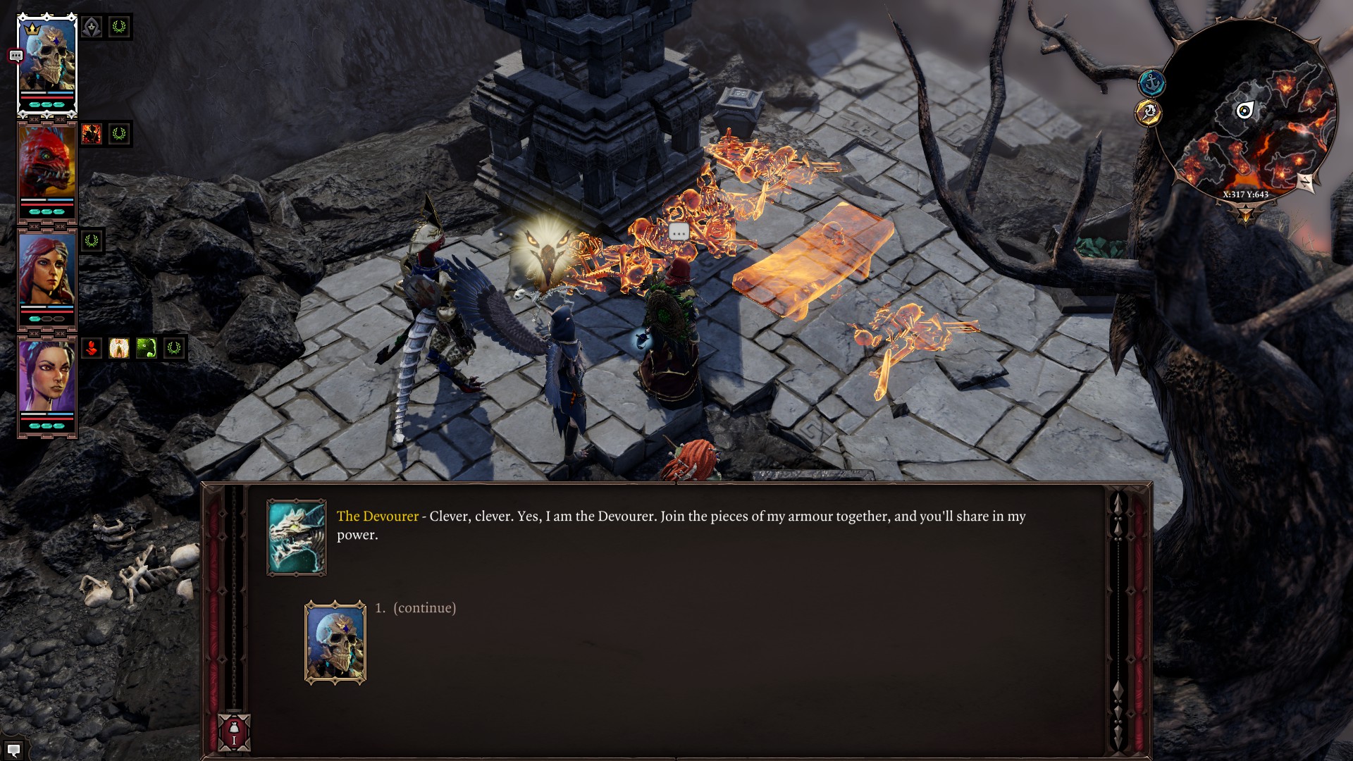 Think about it like this. Nearly every skill type in Divinity: Original Sin 2 needs you to put stat points into either Strength, Dexterity, or Intelligence for you to actually do real damage to enemies. If one of your characters has a lot of Geomancer points, sure they’re getting 5% per point in extra earth and poison damage – on top of 5% more armor restored with skills like Fortify and Mending, but earth and poison skills also scale with intelligence. So, it’s like you’re only getting half the damage if you put points into one but not the other. Same thing with warfare, you need points in warfare, but also strength, and that’s not counting putting points into one-handed or two-handed which also gives you more damage. I’m gonna be honest, that’s kind of a lot. But I guess it’s nice to know that if you want to do as much damage as possible it doesn’t take a lot of effort to figure out what to invest in, you probably won’t be able to max it out until the end of the game. Summoning is different though. Your totems don’t give a shit whether or not you’re strong or intelligent or whatever, you just need to put points into summoning and they’ll do all the work for you. That means you can get really creative with what else you want to do with a character that summons. One of the first things that I found out about was ‘Enrage’. If I just put two points in warfare– the bare minimum to be able to use the skill book, I could give my summons guaranteed critical damage basically for free. Now we’re playing video games. But I’m not done yet. If you play Divinity for a little bit you might start to notice that other schools of magic or whatever also have summons. Pyrokinetic has a skill where you summon a fire slug. Geomancer has a skill where you summon an oil blob (nice). Necromancy has a skill where you can summon a bloated corpse from (if I had to guess with a gun to my head… a corpse), and a bone widow. Let me tell you about this bone widow ladies and gentlemen. This thing does fucking damage. This thing does more damage than all my party members. And that’s before you make it eat a corpse that gives it a 35% damage buff. It is fucking crazy. It is fucking stupid. It is fucking ridiculous. The best part is, is that these summons don’t scale with pyrokinetic or geomancer or necromancy, the scale with summoning! What the actual fuck! You can get away with putting their bare minimum number of points in one or two of these schools and have access to all these summons. This can’t be balanced. You know what’s even more unbalanced? There’s a summoning skill called ‘Supercharger’ that gives you summon or totem fucking double damage, the only downside being that they die their next turn. That kinda sucks. But if you have another summoning skill called ‘Door To Eternity’ you can keep all of your summons and totems alive for three turns, even if they lose all of their HP. That’s kinda bigtime. Enrage + Supercharger on it’s own is around 500% damage, your enemies are living in Spain without the S. (which might just be completely wrong, because honestly that number is so high that it sounds wrong but I’m pretty sure it’s not.) So because summons deal so much damage on their own and don’t require an investment in any damage stats, I just decided it would be better to put more points into constitution and memory – which is a stat that gives you one skill slot for every point you put into it. Which is honestly a really useful stat for any kind of build.